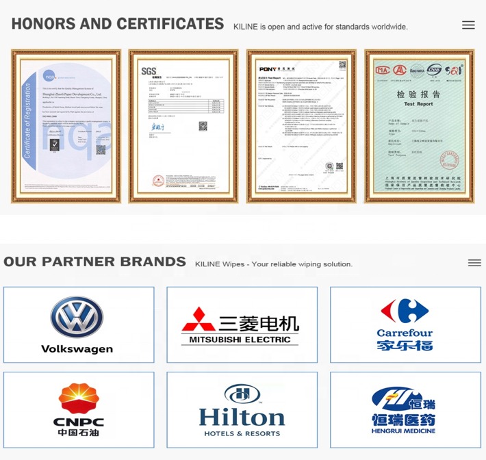 3) With our highly defined production procedure, well trained and skilled production employees, we maintain a relatively low production operation cost level; Q. What other advantages do you have? A. We are a professional manufacturer and supplier of industrial wipes for more than 15 years, and our strengths always are strict quality control and inspection, competitive prices, flexible payment term, quick shipment, excellent services and prompt feedback etc. Q. Do you accept OEM/ODM? A. Yes, we accept customized design, tailored specs and private label manufacturing. Q. How do you develop new distributors? A. We welcome negotiations of agent / distributor sales with us, we’ll have more favorable policy on pricing, payment terms, shipment date in return. Please discuss with our sales representative in details. Q: Any relevant test report/certificate for the products? A: Yes, We can offer test reports/certificates . We have also successfully obtained a lot of of Invention patents. Q: What should I do if I have different product specification needed? A: KILINE has been developing and innovating various special non-woven materials, and keeping improving our current technique. With our advanced equipment and skills, we are able to offer you tailor-made services, and make our products more functional, diverse, and high quality. We are more than pleased to provide you customized services.