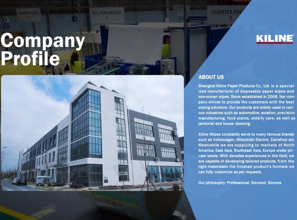 Shanghai Kiline Paper Co., Ltd. is a professional company integrating R&D, manufacturing and sales of industrial wipes and household cleaning products. We have long been committed to the research and development of industrial wipes and civil cleaning. Our products and services are available in more than 20 countries and regions around the world, and more than one million people around the world use our products and services. Among them, industrial cleaning and wiping products are divided into general industrial cleaning and wiping and professional field cleaning and wiping, and the industries involved mainly include electronics, manufacturing, chemical industry, food and drug industry, laboratories and other fields; civilian cleaning products are divided into household cleaning products and outdoor cleaning products Products, household cleaning is used in daily cleaning of kitchens, restaurants, bathrooms, living rooms, etc., and outdoor cleaning products are used in cleaning products for personal needs such as automobiles, travel, and sports. We create a safer, more efficient and healthier working and living environment for our customers through strict quality control, professional service and technical support. We adhere to the business philosophy of "professionalism, concentration, sincerity and faith", and strive to make professional products with professional technology. Since its establishment 15 years ago, Shanghai Kiline Paper Co., Ltd has been recognized by the industry for its integrity, strength and product quality. We will use practical actions to provide more professional, more comprehensive and better services, which is KILINE's commitment.